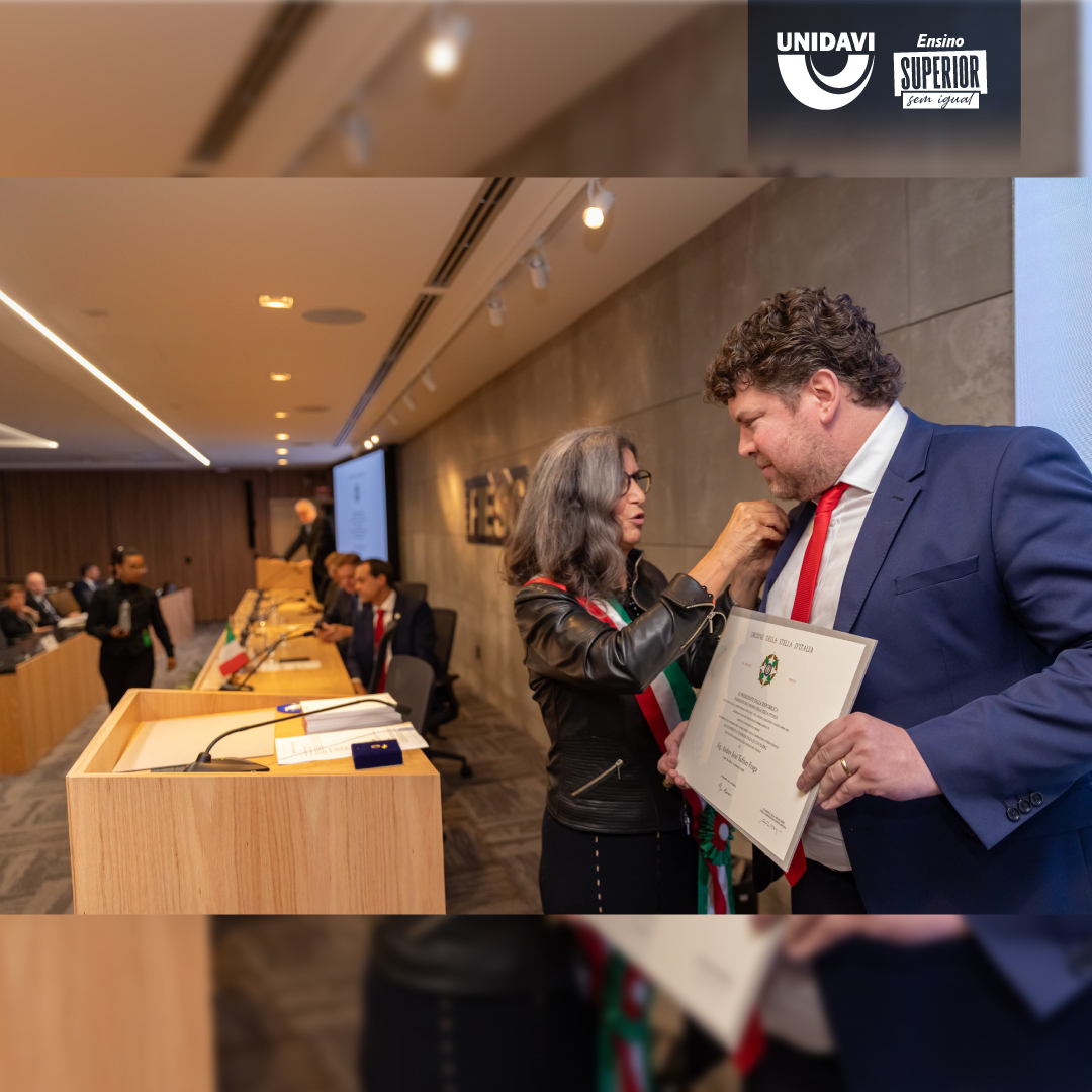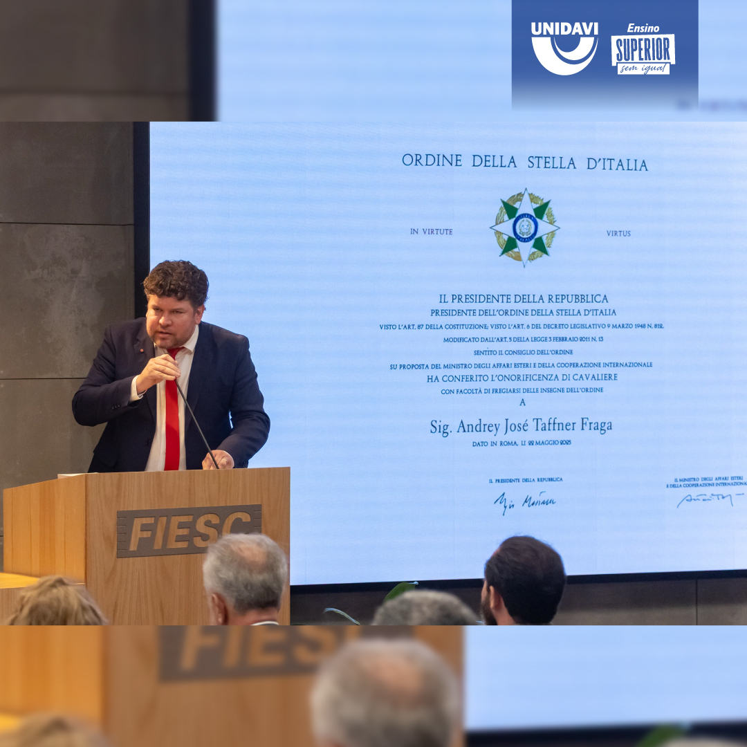 No dia 25 de setembro, em Florianópolis, durante a realização do Fórum Empresarial Brasil - Itália, o Profº M.e Andrey José Taffner Fraga, docente do curso de Direito da Unidavi, recebeu oficialmente o título de ''Cavaliere dell'Ordine della Stella d'Italia'', uma das mais altas honrarias concedidas pelo governo italiano.