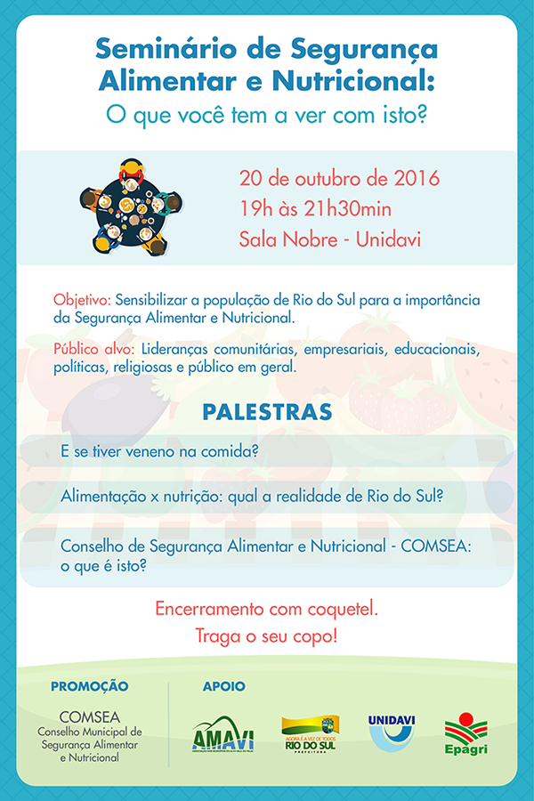 Sala Nobre - UNIDAVI, Rio do Sul O Seminário objetiva sensibilizar a população para a importância da segurança alimentar e nutricional Traga um copo! Confirmar presença no aparecida.23re@gmail.com UNIDAVI, há 50 anos o lugar onde você merece estar!